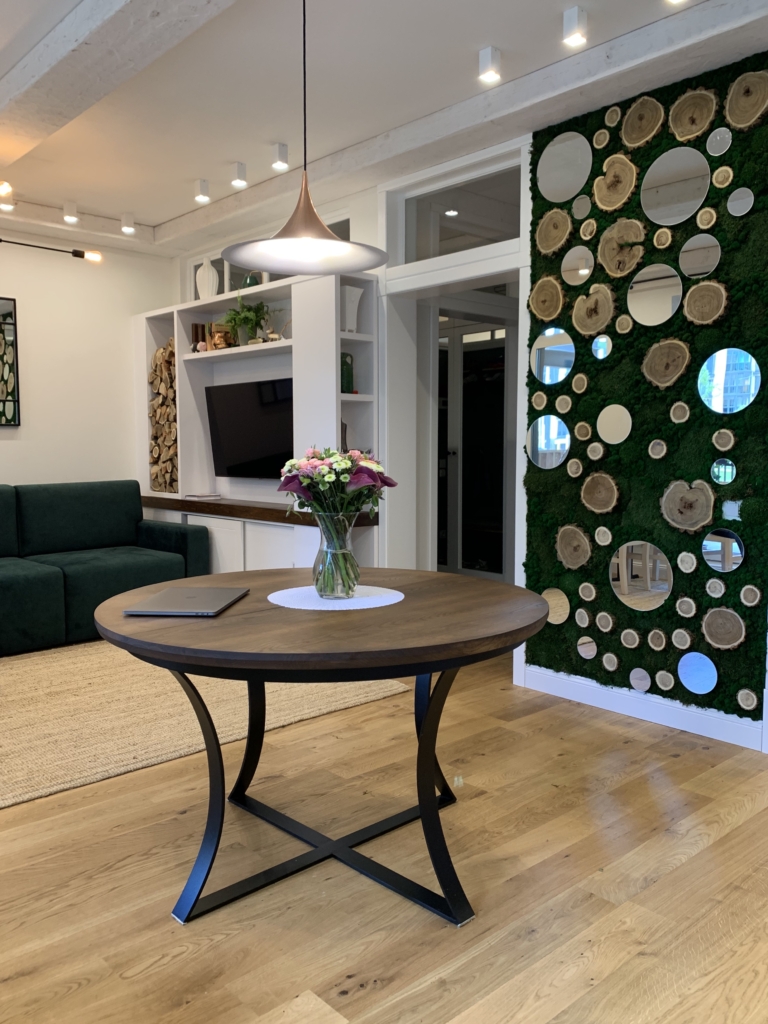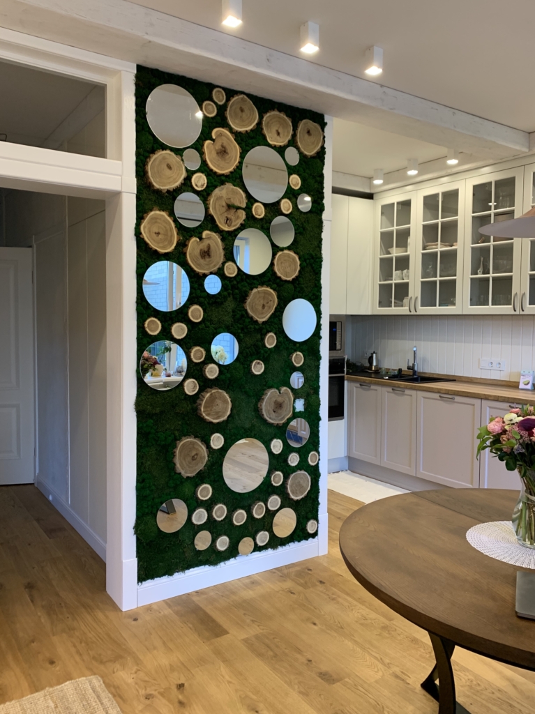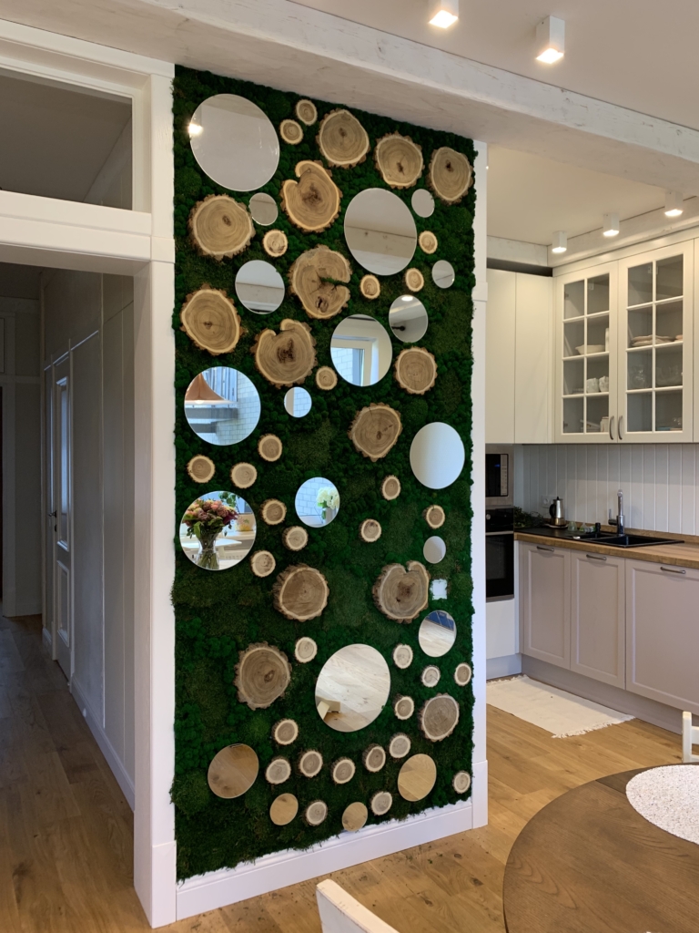 Данная работа расположена в квартире-студии. Выполнена из трех видов стбилизированного мха: мха кочки, плоского мха и ягеля, так же в работе использованы спилы акации и зеркала.