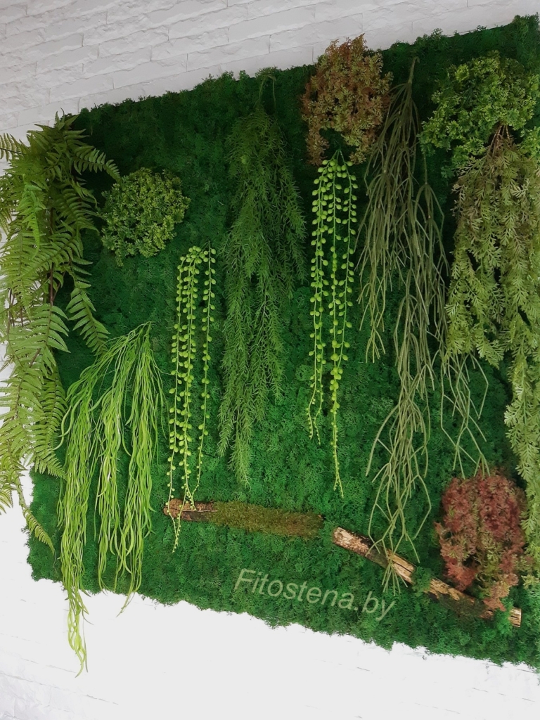 В работе использована основа из стабилизированного мха, на нее закреплены искусственные растения.