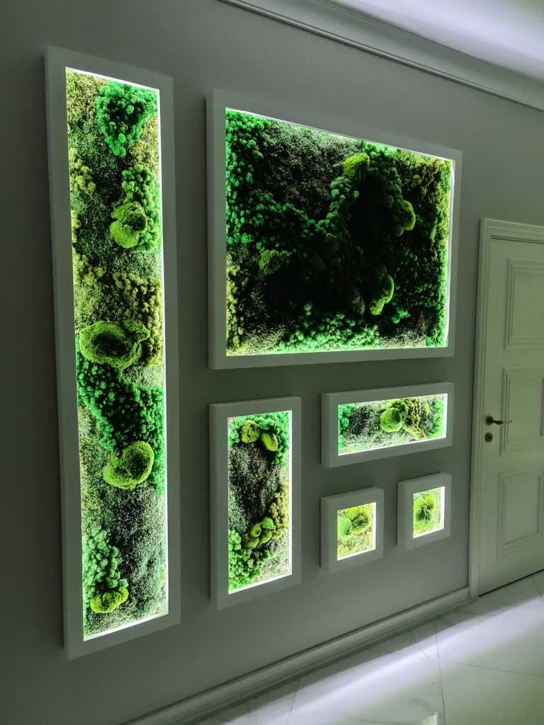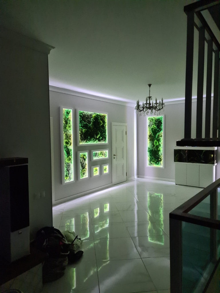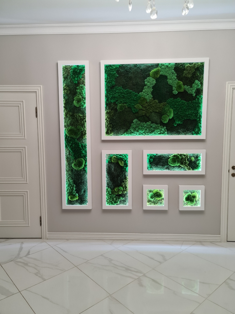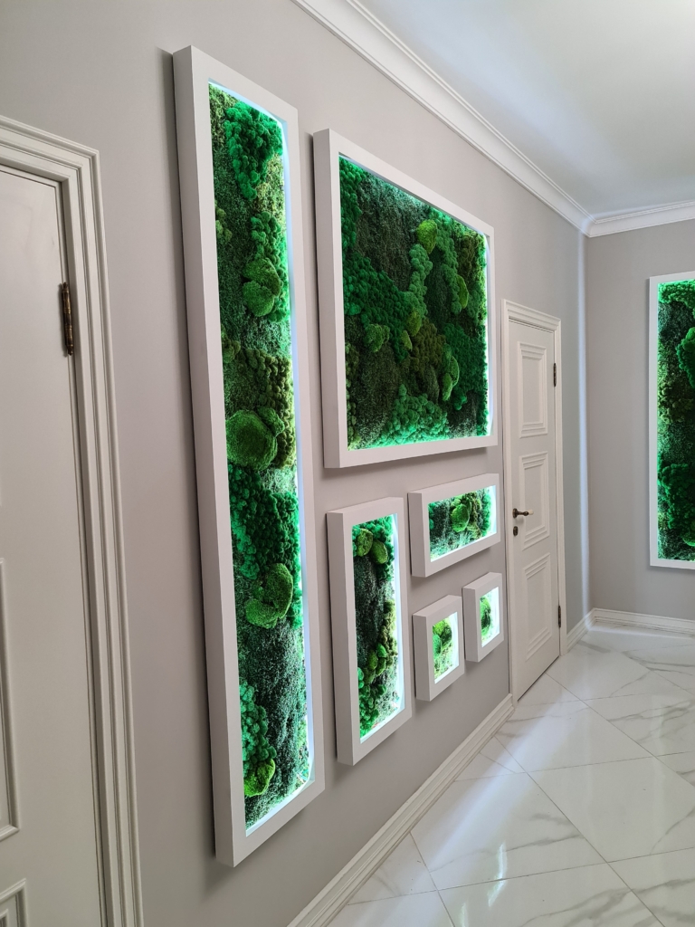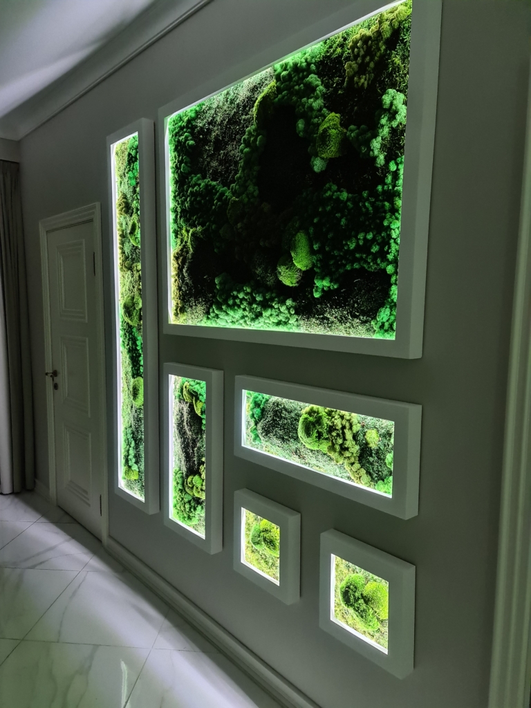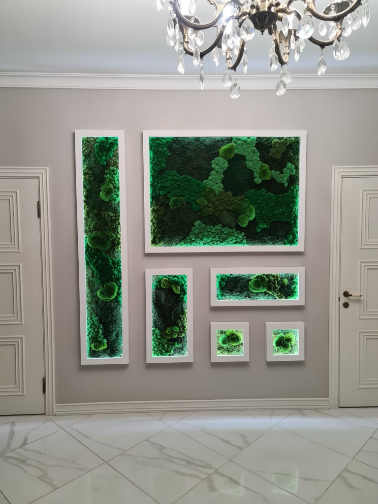 Все картины имеют разный размер, подсветка встроена в обод рамы. Благодаря этому создается эффект объема.