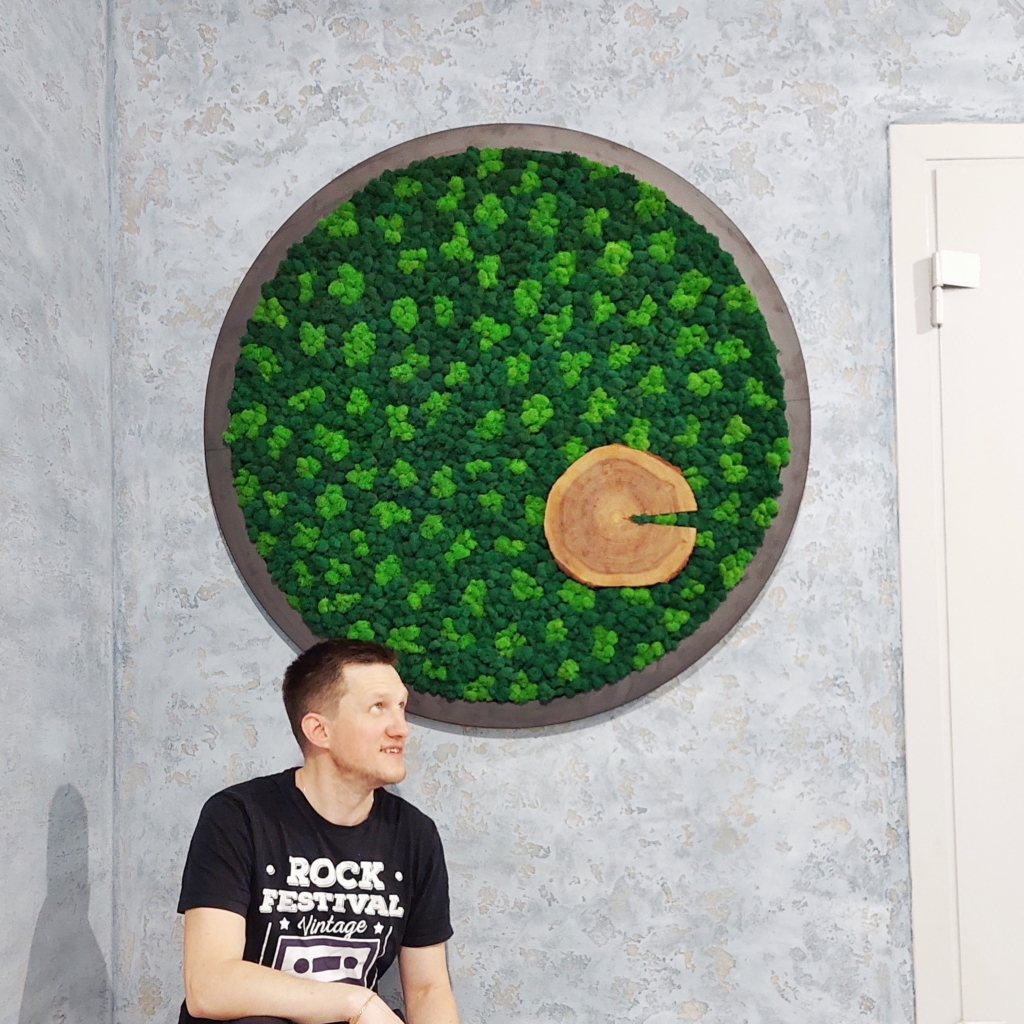 Два цвета стабилизированного ягеля (трава и салатовый) и слэб дерева. Данное панно находиться в холе жилого дома.