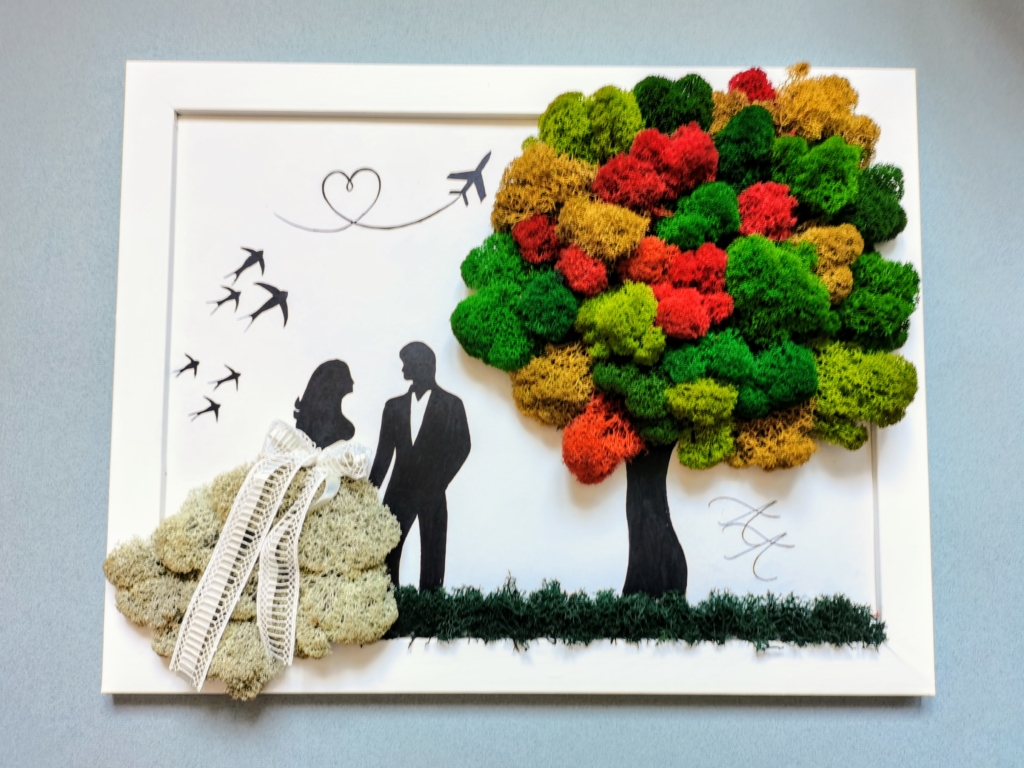 А вот еще одна история: Девушка заказала своей подруге на свадьбу картину из мха с достаточно оригинальным рисунком. Для выполнения этой работы мы специально обращались к художнице, которая прорисовывала детали картины. Работа получилась яркая и не обычная.